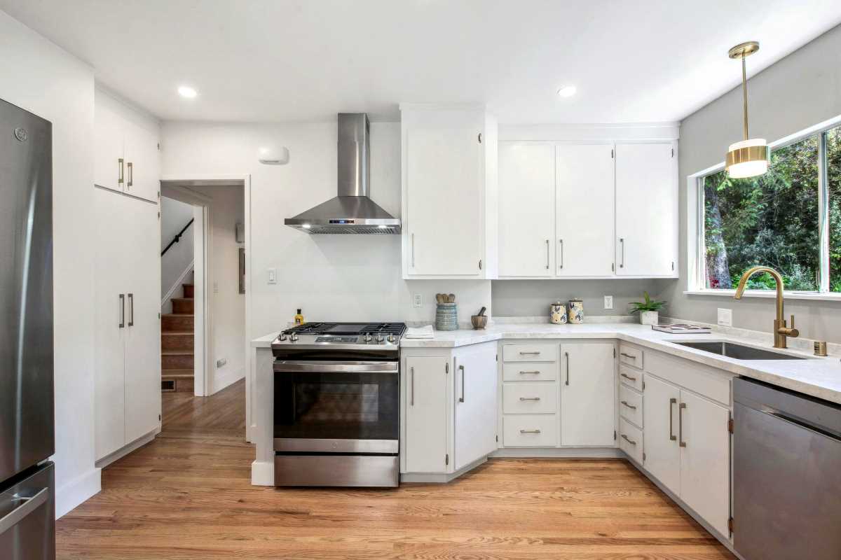 A delightful 4-bedroom, 2-bath home in Berkeley near Kensington Village was completely refreshed inside and out by VisionWorks Home Design. Improvements included an exterior redesign with new paint and stain, plus selective removal of trees and bushes. New plants, pavers, and exterior lighting completed the transformation. The kitchen received new countertops, sink, faucet, and appliances and a cabinet refinish. Interior painting throughout complements new hardwood flooring. Bathrooms were updated and refreshed with new vanities, sinks, faucets and mirrors. General repairs and electrical updates rounded out the project.